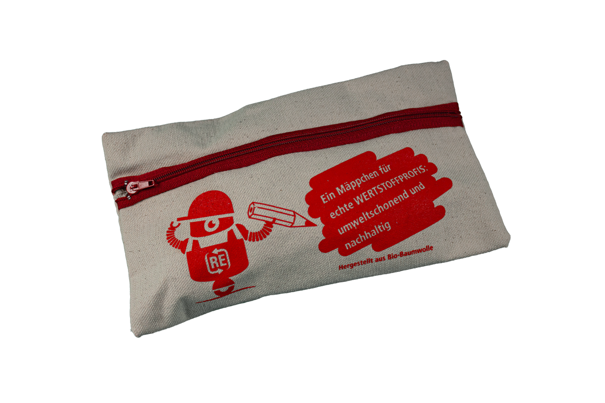 Das Schreibset der WERTSTOFFPROFIS besteht aus einem robusten und langlebigen Federmäppchen aus Biobaumwolle, dem ROBIN-Radiergummi sowie einem Anspitzer und Bleistift aus recyceltem Material (Graphitkern aus ca. 40% Graphit und 60% aus recyceltem Kunststoff und das Äußere aus CD Hüllen)